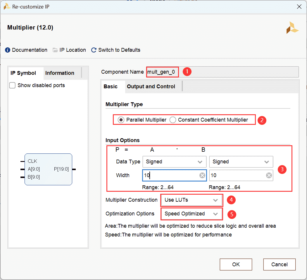 | ② | 乘法类型 | Parallel Multiplier:并行乘法器,即输入数据A和B可变 Constant Coefficient Multiplier:固定系数乘法器,即只有一个数据输入; |