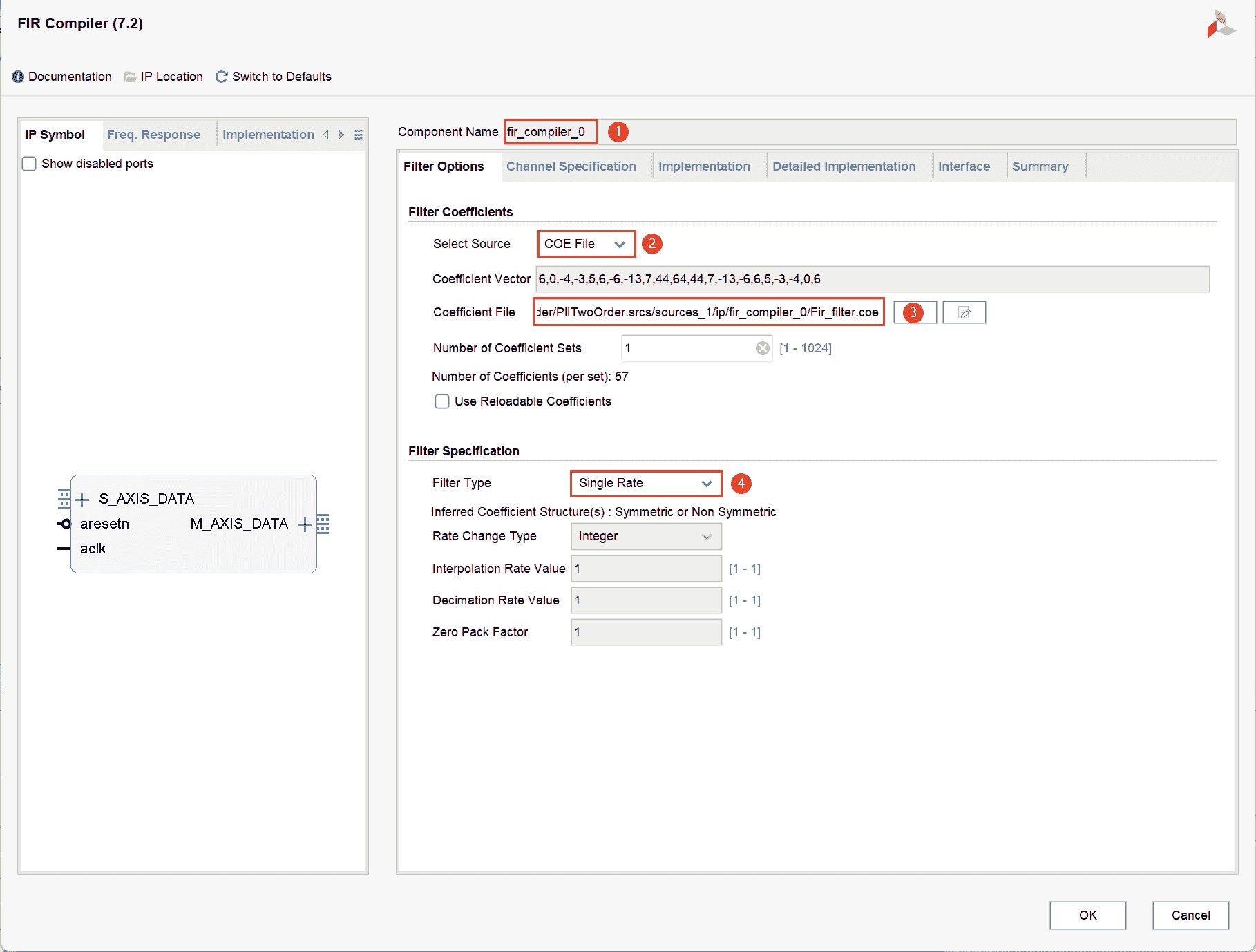 | ③ | coe文件路径 | 文件存放路径 | d:/FPGA_Prj/PllTwoOrder/PllTwoOrder.srcs/ sources_1/ip/fir_compiler_0/Fir_filter.coe |