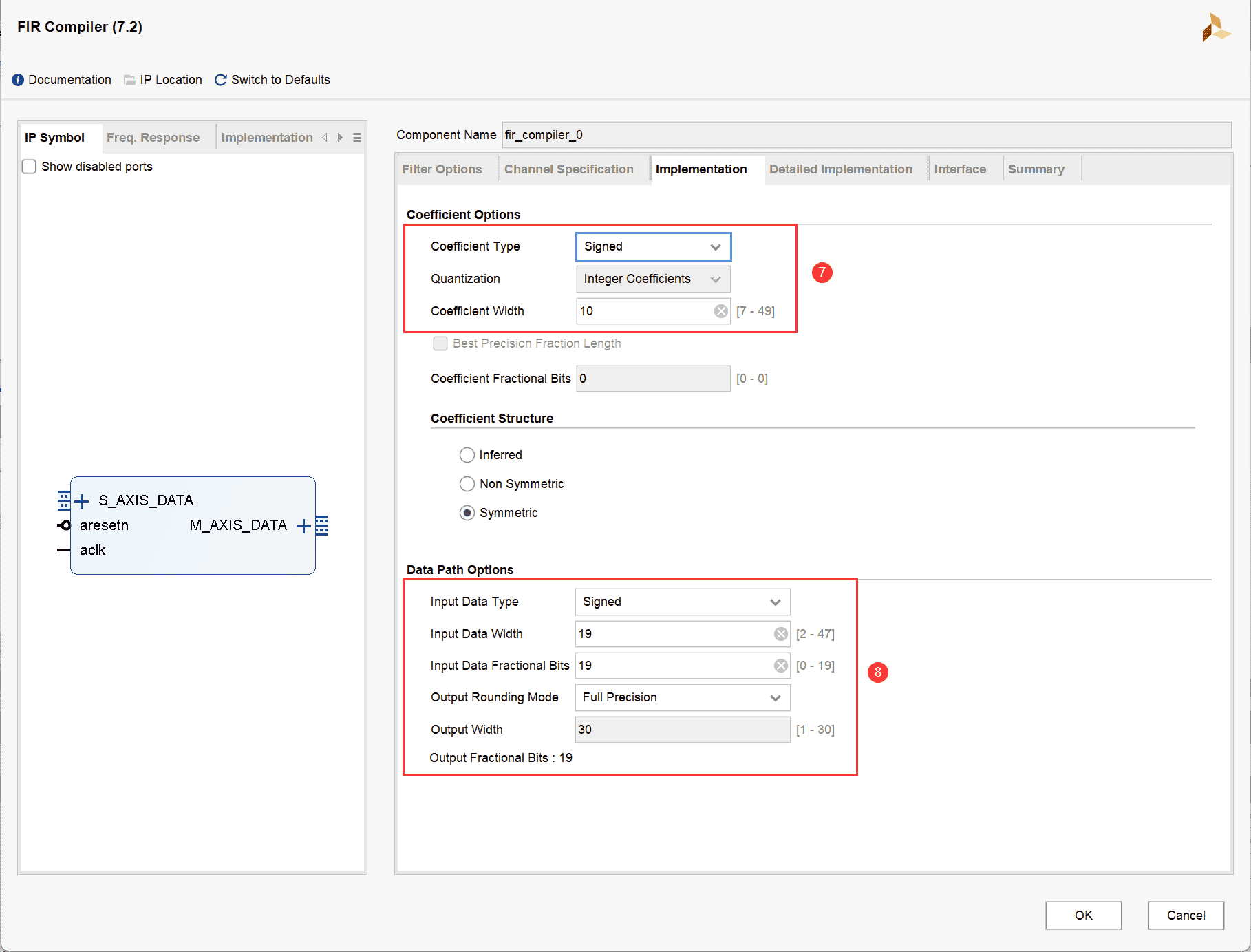 | ⑧ | 输入数据配置 | 输入数据类型、位宽、小数位数、近似方式、输出位宽 | 有符号/19/19/全精度/30 |
