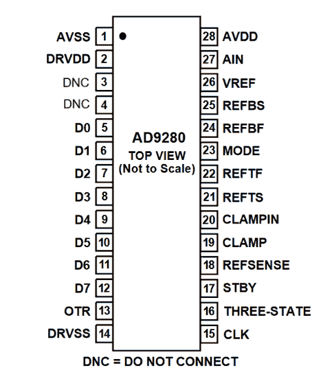 其中AD9280芯片的转换速率为32MSPS。芯片量程为+5V~-5V,代表量程范围是10V;数据位宽为8位,代表数据可以从0—255,即256个数据;10V/256 ≈ 0.04V,这表示输入的模拟信号每升高0.04V,则输出的数字信号的值加1。